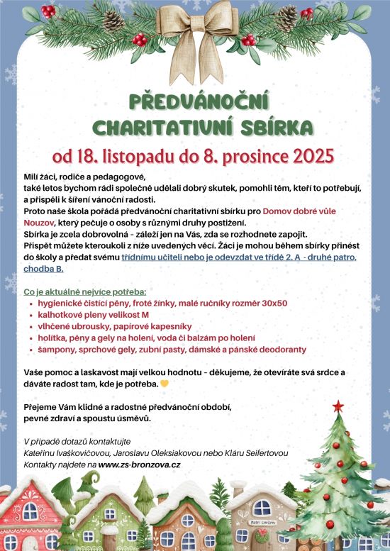Proto naše škola pořádá předvánoční charitativní sbírku pro Domov dobré vůle Nouzov, který pečuje o osoby s různými druhy postižení. Sbírka je zcela dobrovolná. Záleží jen na Vás, zda se rozhodnete zapojit.