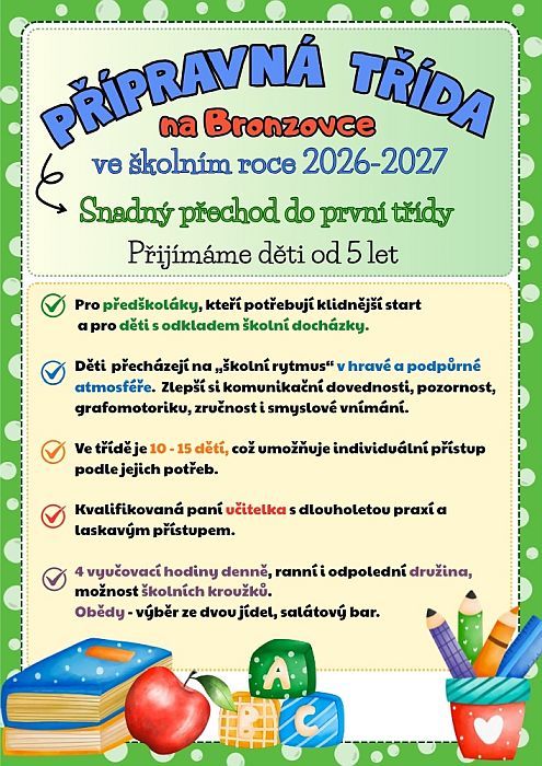 - Ve školním roce 2026/2027 budeme otevírat 1 přípravnou třídu po 10 - 15 žácích.